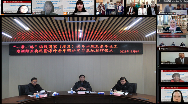 12月8日,“一带一路”沿线国家(埃及)老年社工及老年护理在线培训结业典礼暨海外老年照护实习基地挂牌仪式在线上举行,我校国际合作与交流中心主任孙玉中,民政与社会治理学院院长周良才、副院长李飞虎、民政服务与管理专业带头人易丹,本哈大学中埃关系协调员Elsawy Elsawy Ahmed教授,开罗大学社区服务和环境发展学院副院长 Dina Aboul Fotouh教授,曼苏尔大学护理学院院长Amina El-Nemer教授,埃及中国大学物理治理学院院长Sami Nassif、Samy Abdel Samad Nasef及我校授课教师代表参加典礼及仪式,会议由民政与社会治理学院罗雁主持。