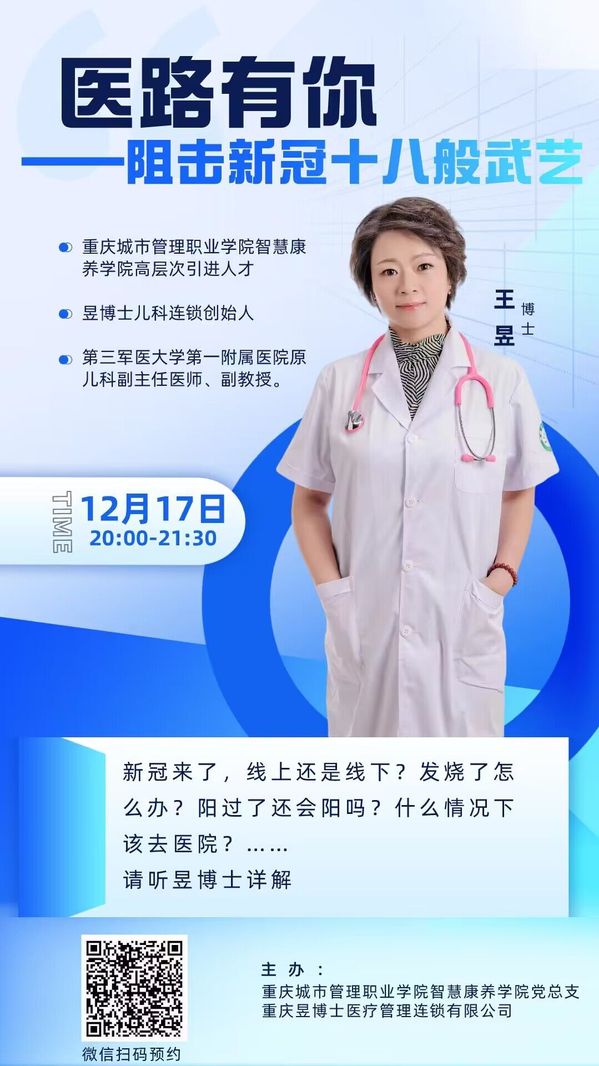为提高我校师生的防范意识,增强疫情防控能力,科学、理性抗疫,12月17日,智慧康养学院党总支联合重庆昱博士医疗管理连锁有限公司举办了“医路有你——阻击新冠十八般武艺”线上科普讲座。讲座由我校智慧康养学院高层次引进人才、昱博士儿科连锁创始人、第三军医大学第一附属医院原儿科副主任医师、副教授王昱博士主讲。我校600余名师生观看了直播。讲座围绕发热该怎么办、有基础性疾病的人群阳了该怎么办、线上上课好还是线下上课好等师生迫切的问题展开。