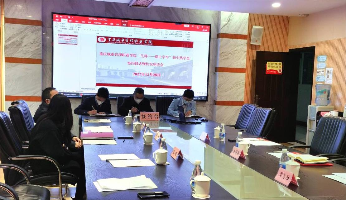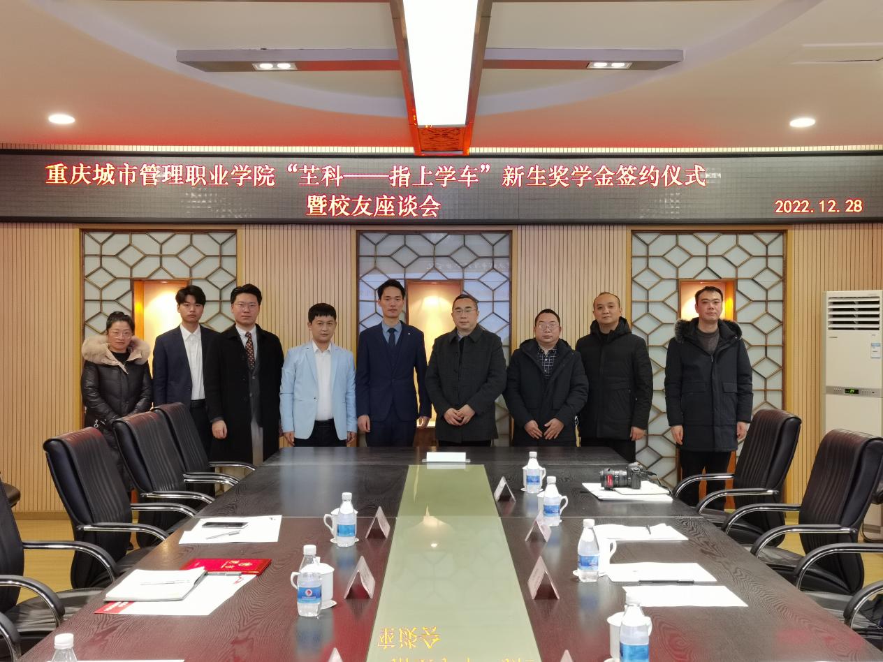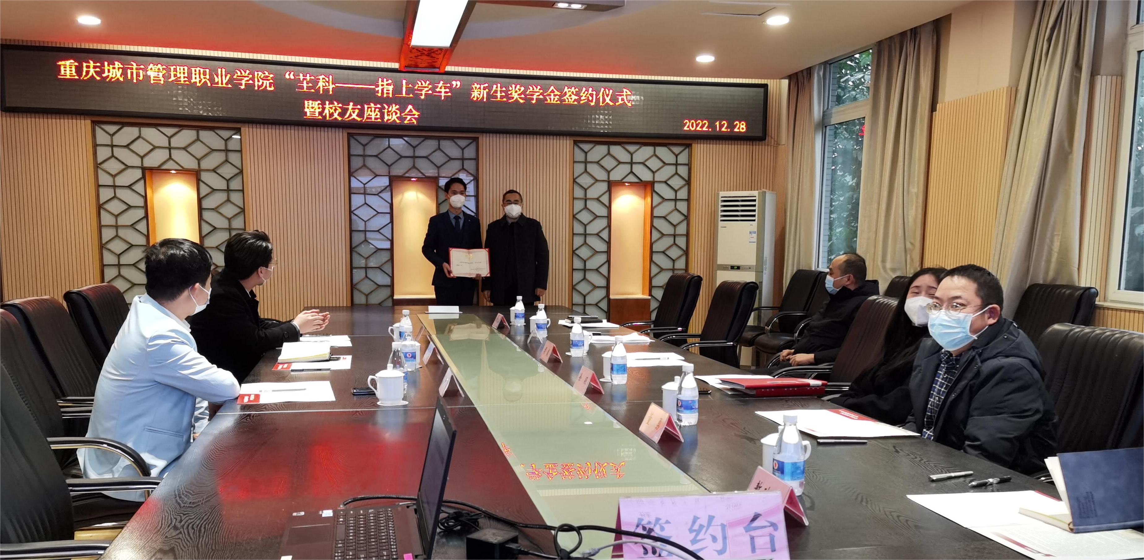 12月28日,我校在办公楼第三会议室举行“芏科——指上”新生奖学金签约仪式暨校友座谈会。学校副校长周毅,招生处处长、校友办主任徐颖,学生处处长程静,大数据与信息产业学院党总支书记董勇、副书记江茂森,重庆芏科科技有限公司总经理陈科霖,重庆最简包装科技有限公司总经理周志胜,重庆市渝都汽车驾驶培训学校董事长蒋敏等参加签约仪式。校友座谈会由程静主持。