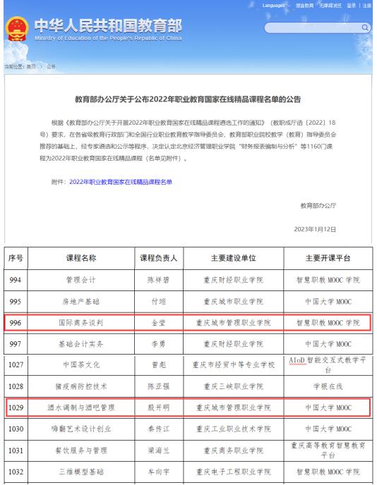 近日,教育部办公厅发布《关于2022年职业教育国家在线精品课程名单的公告》,经专家遴选和公示等程序,我校商学院金莹老师主持的《国际商务谈判》和文化与旅游学院殷开明老师主持的《酒水调制与酒吧管理》课程成功入选。