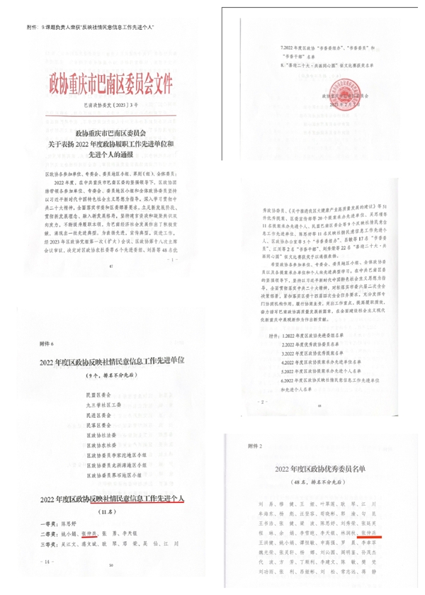 近日,政协重庆市巴南区委员会发文通报表彰2022年度政协履职工作先进单位和先进个人,我校科研与发展规划处学报编辑部副主任、巴南区政协委员、民革巴南区委副主委张仲兵教授被评为“2022年度区政协优秀委员”,获“2022年度区政协反映社情民意信息工作先进个人二等奖”。