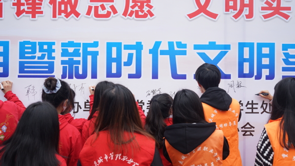 全体参会人员在主题背景上签名,拉开了学雷锋志愿服务月暨新时代文明实践主题活动的序幕。