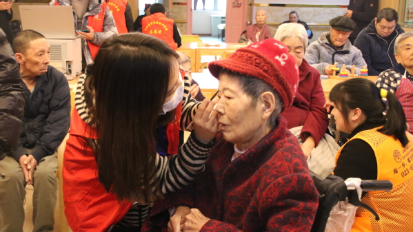 “看镜头,西瓜甜不甜。”由文化与旅游学院人物形象专业学生组成的志愿者服务团队为香炉山街道养老服务中心平均年龄为70岁以上的老人梳妆打扮、拍照留影。在一片欢声笑语中,志愿者们将一张张洋溢着幸福笑脸的照片送到每位爷爷奶奶手中,老人们接过照片,流露出幸福的笑容。