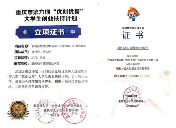 3月2日,我校廖付容、马如佳两位同学的创业项目“新蚕丝生物技术--保留122种丝蛋白的蚕丝基布”,在第六批“优创优帮”大学生创业扶持计划总评比中,表现出色,获得专家评审一致肯定,成功入驻大创慧谷项目种子库。
