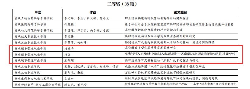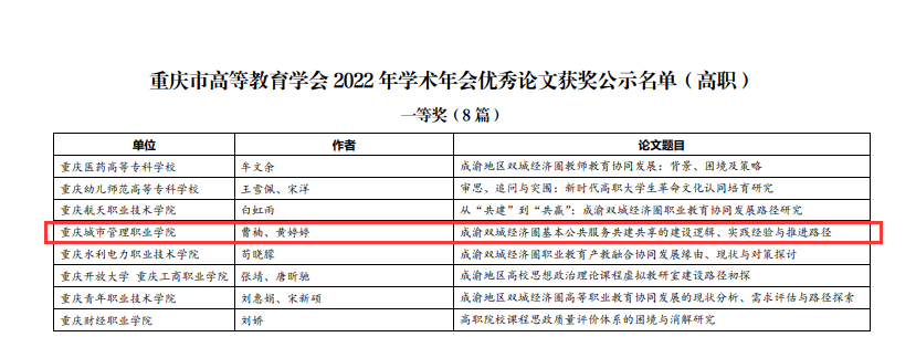 近日,重庆市高等教育学会发文公布了2022年学术年会 《贯彻二十大,奋进新征程,推进成渝地区双城经济圈高等教育创新发展》优秀论文获奖名单。