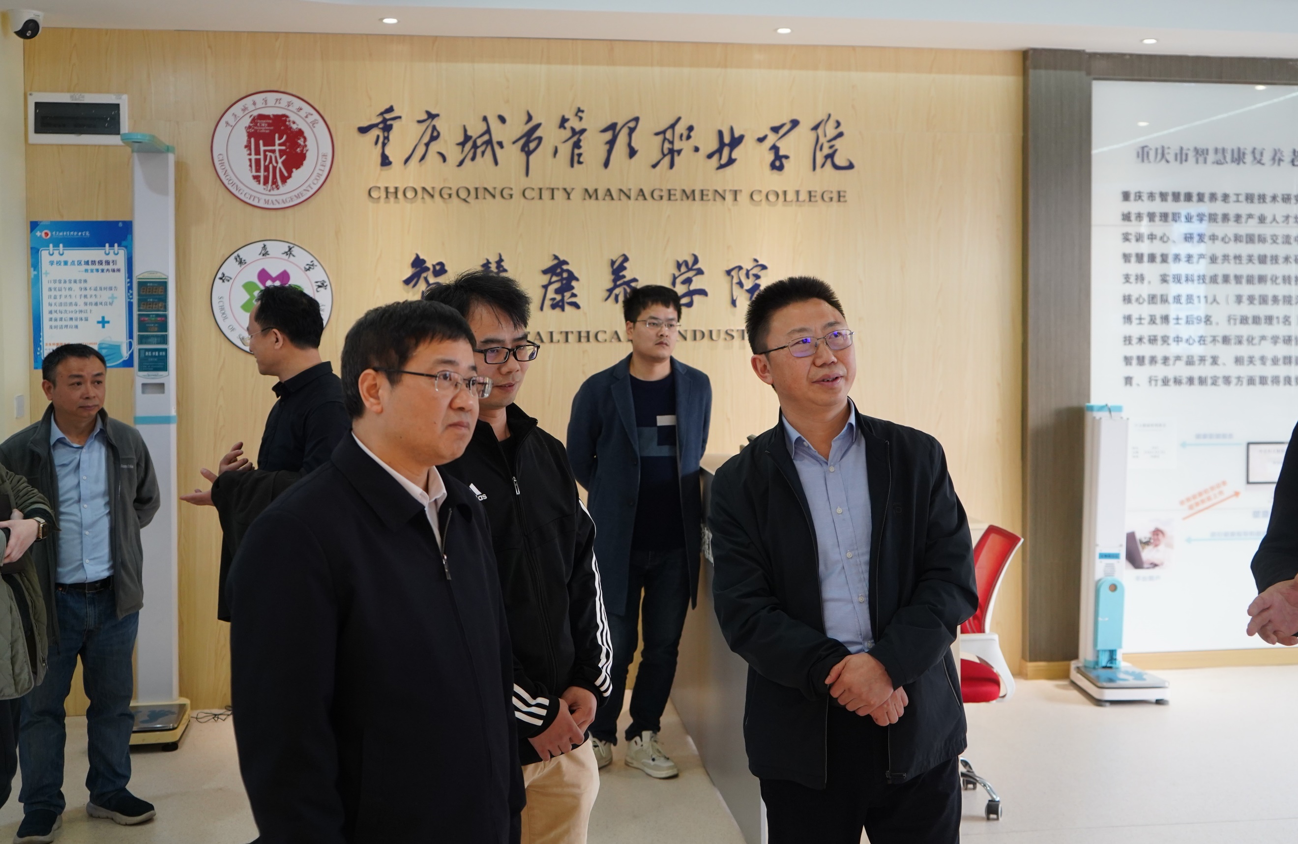 3月8日,重庆市乡村振兴局党组成员、副局长王仕杰,人力资源处处长孙元忠一行莅临我校调研指导劳务品牌研究院筹建工作,实地考察了重庆市智慧康复养老工程技术研究中心、智慧物流全流程产教融合实训基地、世界技能大赛美容项目集训基地。学校领导和相关部门、二级学院负责人陪同参观。