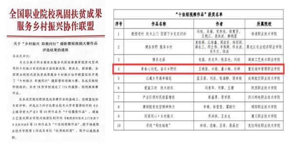 据悉,此次“乡村振兴 职教同行”摄影暨短视频大赛,全国共有58所高校报送了116件作品,通过组织专家评审,最终评选出10件“十佳短视频作品”、“十佳摄影作品”、“优秀组织奖”,大赛旨在总结职业院校在巩固拓展脱贫攻坚成果同乡村振兴有效衔接的有益经验和有效做法,宣传推介职业院校实践成果。