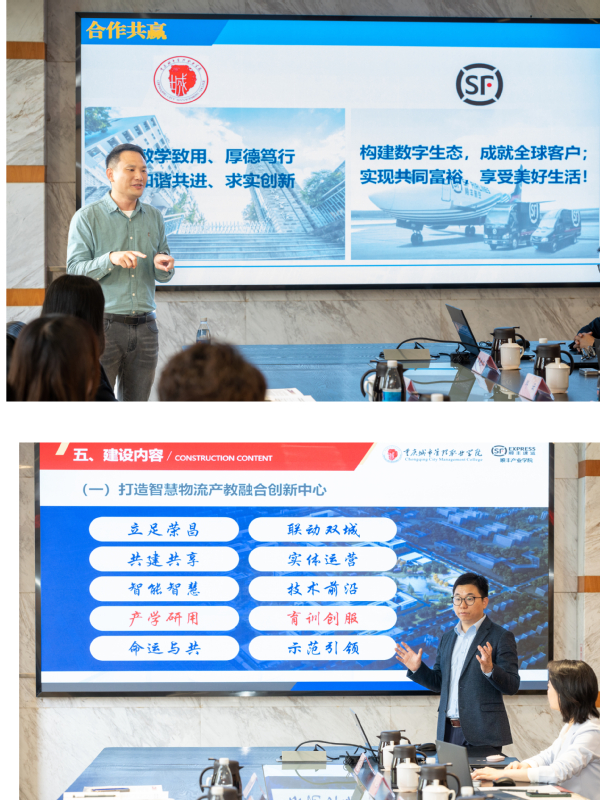顺丰速运重庆区人力资源总监王自鹏、学校商学院副院长邱云共同介绍了顺丰产业学院建立框架、合作概况及顺丰产业园(荣昌校区)初步规划等。