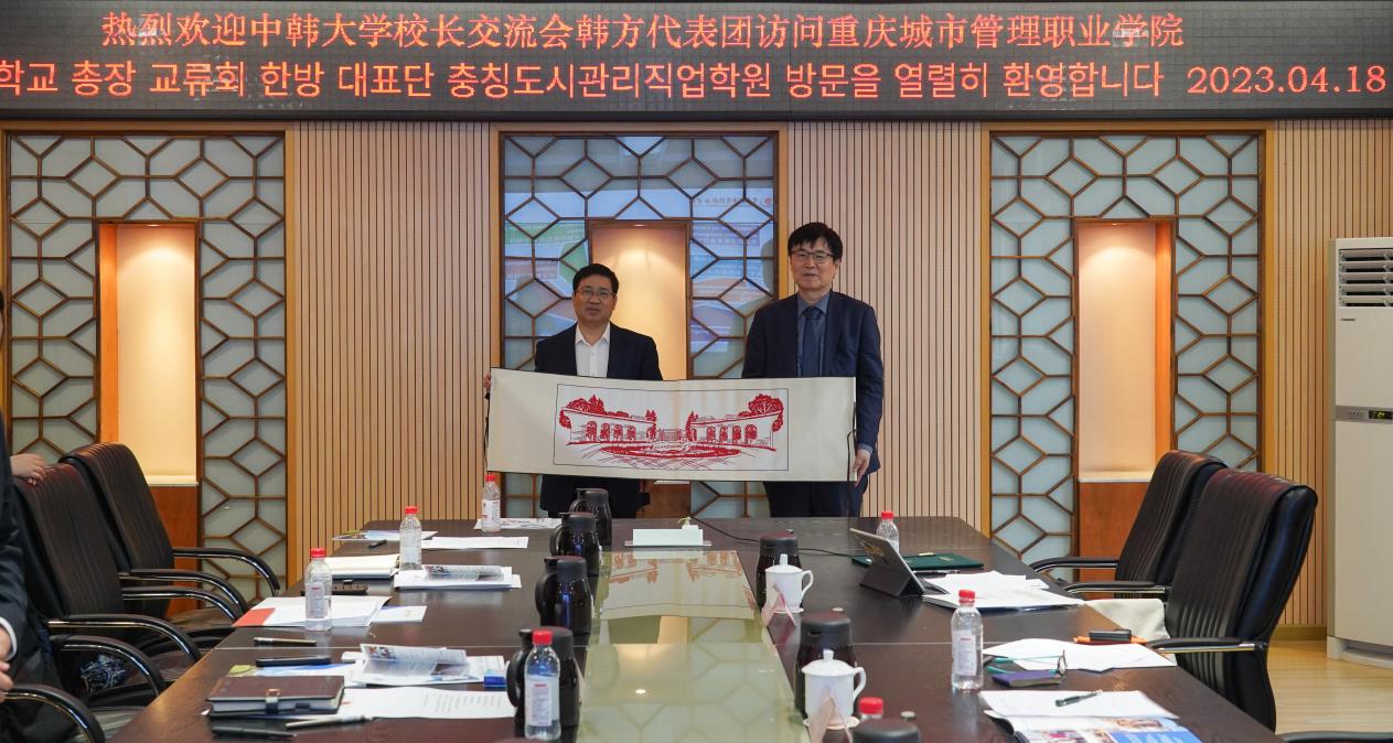 随后,我校参会领导与韩方代表团就中外合作办学、学生交流互换、师资培训与交流、科研项目等进行了交流,并就具体项目达成初步合作意向。邓明国校长向韩方代表团赠送纪念品并进行合影留念。