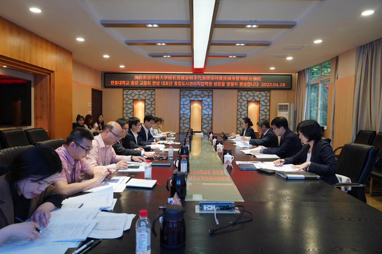 根据重庆市教委安排,4月18日下午,韩国建阳大学校长金容夏、蘇妍教授,韩国明知大学副校长宣正源、金秀炫主任一行4人来我校访问。校长邓明国会见韩方代表团,代表学校对代表团的来访表示热烈欢迎。副校长莫堃主持会议,国际合作与交流中心主任孙玉中、大数据与信息产业学院院长翁代云、文化与旅游学院院长柏文涌、智能工程学院院长彭勇、智慧康养学院副院长雷靳灿及相关工作人员参加会议。