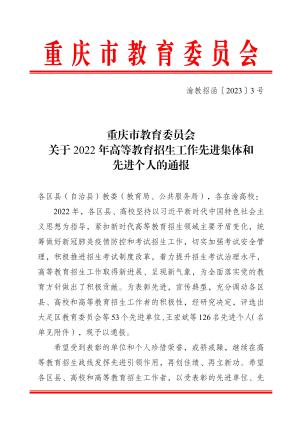 近日,重庆市教委发布《关于2022年高等教育招生工作先进集体和先进个人的通报》(渝教招函〔2023〕3号)文件,我校招生处获评重庆市2022年高等教育招生工作先进集体,杨偲艺同志获评重庆市2022年高等教育招生工作先进个人。