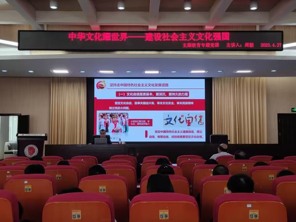 为深入开展学习贯彻习近平新时代中国特色社会主义思想主题教育,全面、系统、深入学习习近平新时代中国特色社会主义思想,完整准确掌握习近平新时代中国特色社会主义思想的主要内容,推动党员、干部真学真懂真信真用,4月27日,学校党委委员、副校长周毅结合文化与旅游学院专业特色,在办公楼103会议室以“中华文化耀世界——建设社会主义文化强国”为主题为文化与旅游学院党总支讲了专题党课。文化与旅游学院全体教师及学生党员近100人聆听了党课。