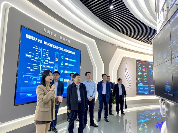 座谈会后,邓明国一行赴鲲鹏计算产业生态重庆中心参观并交流。华为云重庆总经理王磊介绍了鲲鹏CPU构建的国产化全栈IT基础设施及行业应用及服务。华为重庆政企教育行业代表魏溶介绍了鲲鹏计划。