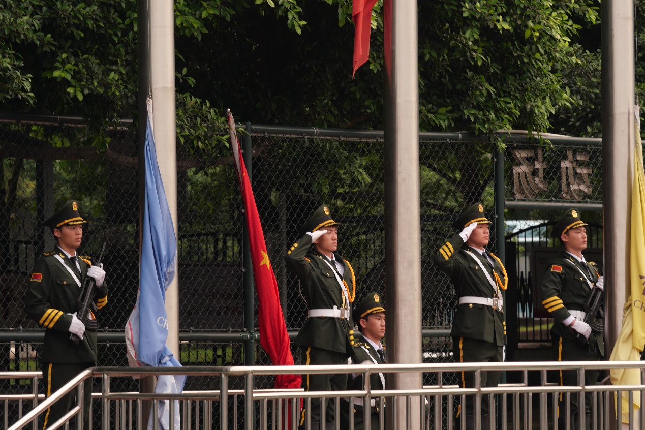 “五四”精神,薪火相传。仪式第一项议程,由54名青年师生代表组成的队伍并排而立在操场前侧,共同传递五星红旗。在全体师生的注目下,旗帜伴着庄重而肃穆的《义勇军进行曲》缓缓升起。现场同学们坚定的目光紧跟着五星红旗,激情澎湃的爱国情感油然而生。