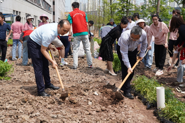 启动仪式后,现场师生一同前往基地开展劳动实践活动,大家挥锄铲土、栽种新苗、培实新土、握壶浇水……不亦乐乎,纷纷变身变身农耕小能手,把“劳动最光荣、劳动最伟大、劳动最崇高、劳动最美丽”的思想观念“种”进心中。