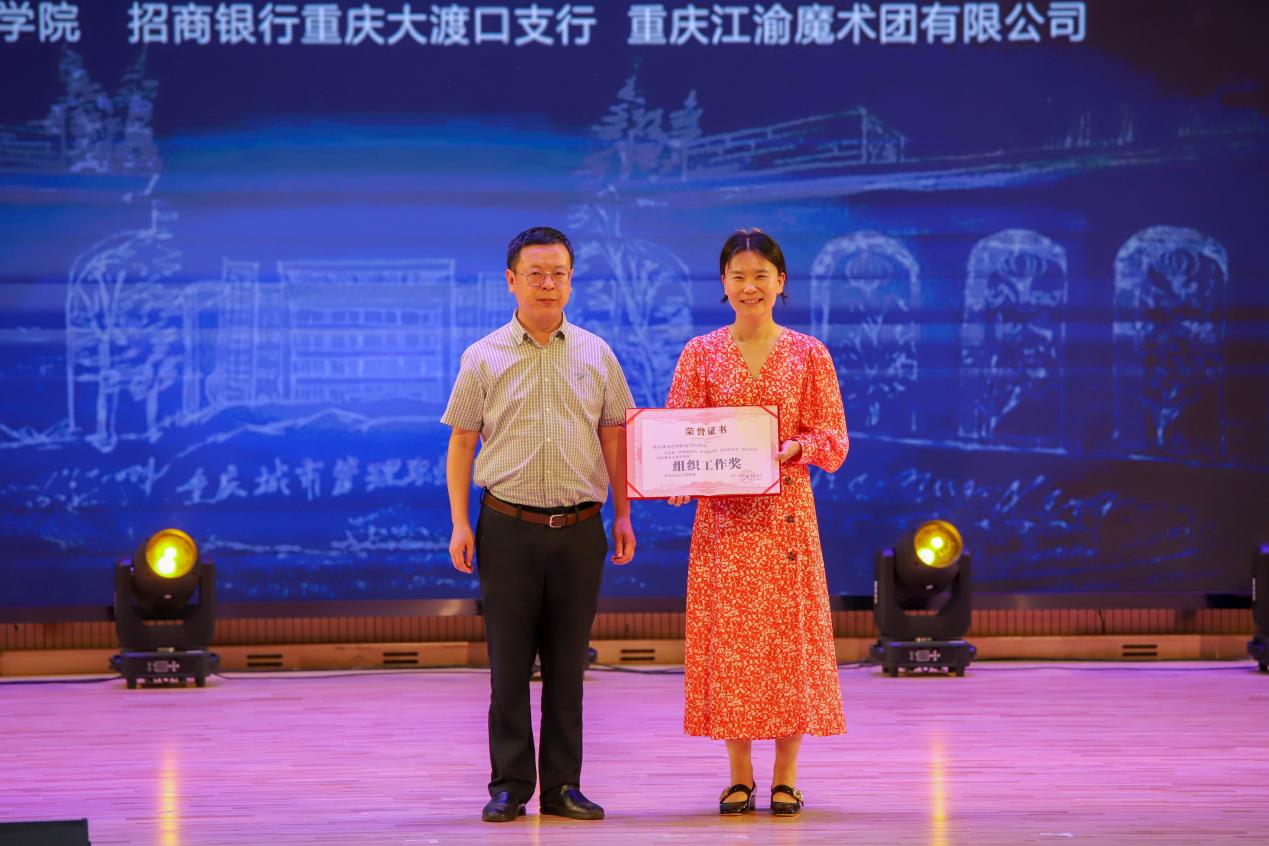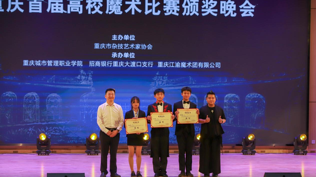 央视春晚魔术师胡凯伦宣布比赛获奖选手名单,与会领导为获奖选手颁奖,重庆市杂技艺术艺术家协会秘书长刘勇为重庆城市管理职业学院颁发优秀组织奖。