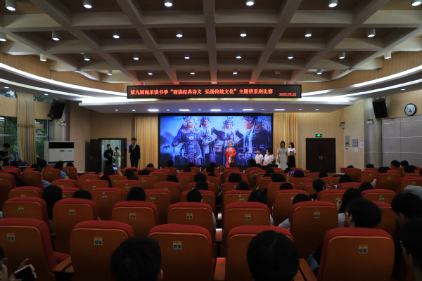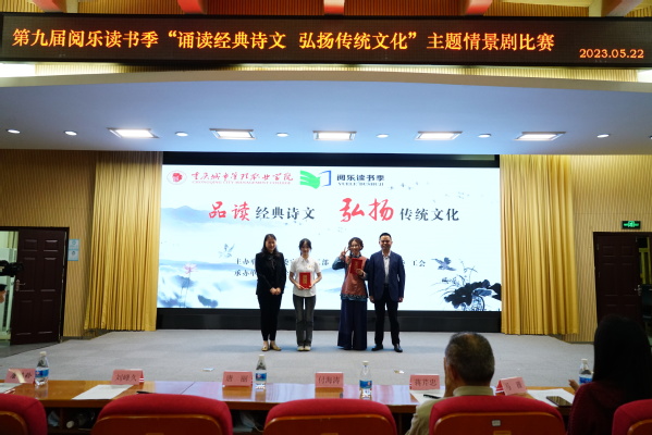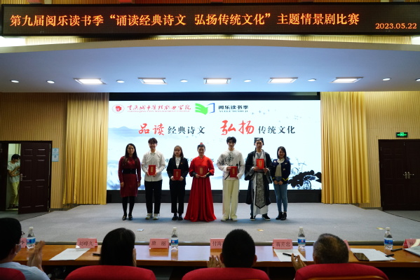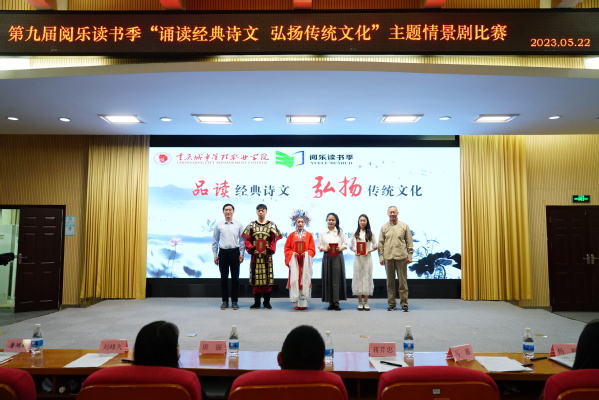 为深学笃用习近平新时代中国特色社会主义思想,深入学习贯彻党的二十大精神,践行社会主义核心价值观,切实推动全民阅读活动,着力营造良好读书氛围,5月21日,由学校党委宣传网工部、学生处、图书馆、团委、工会主办,商学院承办的第九届阅乐读书季“品读经典诗文 弘扬传统文化”主题情景剧比赛在办公楼第一会议室举行。学校党委组织部部长付海涛,党委宣传网络工作部副部长、机关党总支书记刘峰久,商学院党总支书记蒋芹忠、纪检监察室主任唐丽,商学院党总支副书记唐鸿铃、党政办公室副主任马薇、档案馆馆长杨柳以及各二级学院的师生代表参加本次活动。
