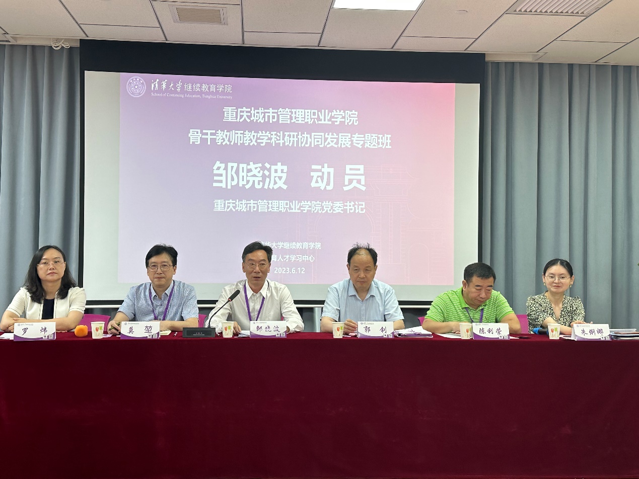 为深入贯彻落实习近平总书记关于加强教师队伍建设的重要指示精神,着力建设一支支撑学校高质量发展的现代化教师队伍,6月12日,学校依托清华大学继续教育学院先进教育资源,开展了骨干教师教学科研协同发展专题培训。清华大学继续教育学院副院长郭钊、教育人才学习中心副主任罗炜,我校党委书记邹晓波、副校长莫堃,党委教师工作部部长、人力资源处处长陈利荣出席开班典礼。学校44名高学历教师参加了此次培训。