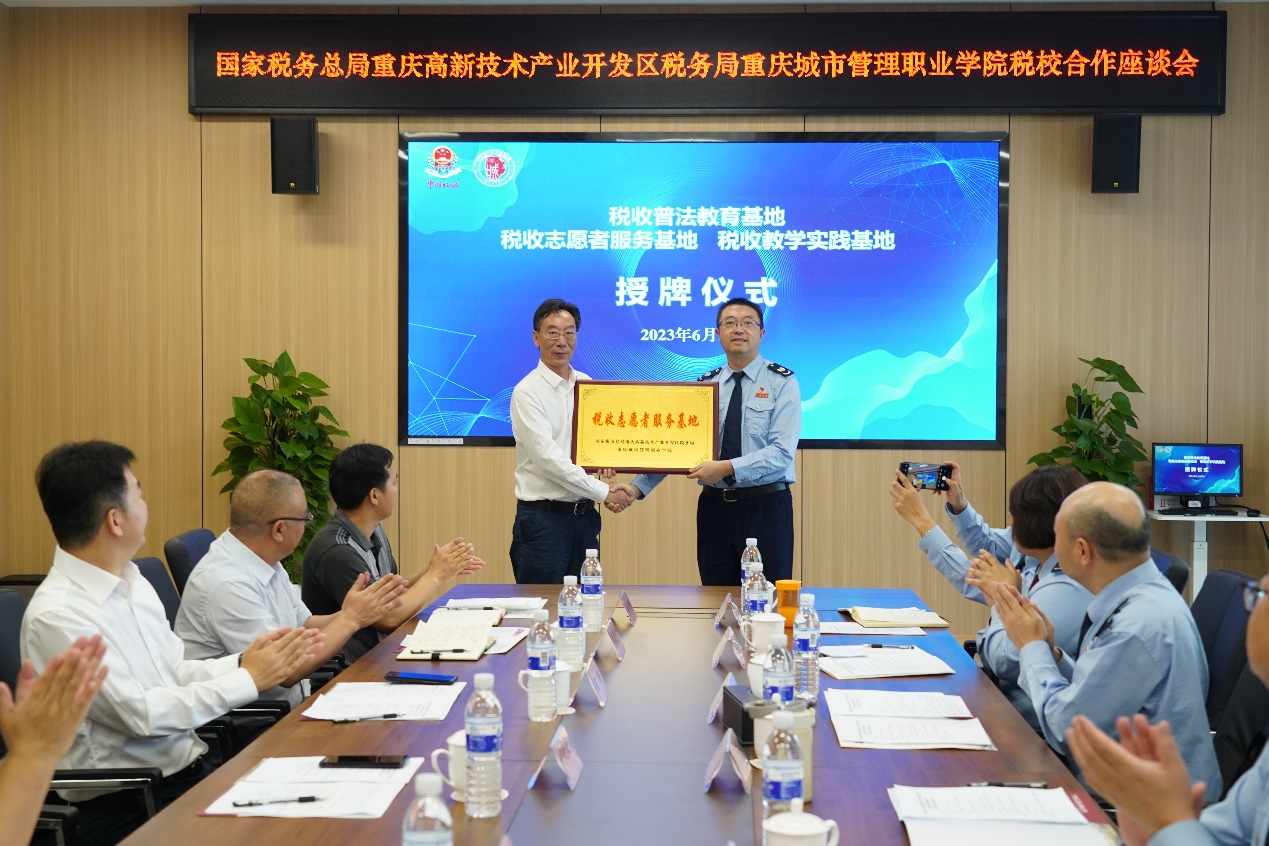 签约仪式后,双方相互授牌。黄伟局长代表重庆高新技术产业开发区税务局授予重庆城市管理职业学院“税收志愿服务基地”“税收普法教育基地”,邹晓波书记代表重庆城市管理职业学院授予重庆高新技术产业开发区税务局“税收教学实践基地”。