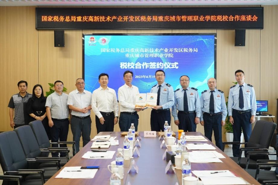 6月19日,我校与国家税务总局重庆高新技术产业开发区税务局举行税校合作签约仪式。国家税务总局重庆高新技术产业开发区税务局党委书记、局长、督办黄伟,党委委员、总会计师、三级高级主办何明,党委委员、副局长、三级高级主办胡伟华一行与我校党委书记邹晓波,党委委员、副校长袁国,产教融合中心主任江柯,数智财经学院党总支书记蒋家宁、副院长黄菊英、党总支副书记刘小刚、副院长黄倩,以及学院教办、学办主任、教研室主任、校企合作专员等出席了此次活动。