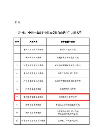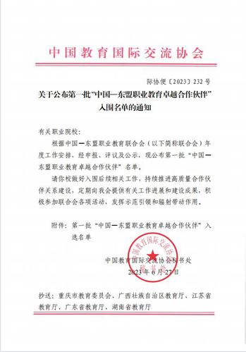6月27日,中国教育国际交流协会公布第一批“中国-东盟职业教育卓越合作伙伴”,我校与合作院校柬埔寨经济管理大学成功入选。第一批“中国-东盟职业教育卓越合作伙伴”是中国教育国际交流协会根据中国-东盟职业教育联合会年度工作安排,面向全国遴选评议出20所为中国-东盟职业教育发展做出示范引领和辐射带动作用的院校和企业。本次入选“中国-东盟职业教育卓越合作伙伴”是对我校与柬埔寨经济管理大学长期开展深入合作的充分肯定,也是我校面向“一带一路”“走出去”引领示范成效作用的展示。