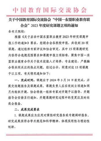 据悉,本次“中国-东盟职业教育联合会”2023年度研究课题是中国教育国际交流协会通过组织专家评议和协会审定,评议出15 项课题研究内容符合选题范围要求和课题申报立项标准,聚焦中国一东盟职业教育合作关于技术技能人才培养、专业建设、产教融合等共同关注的热点问题。