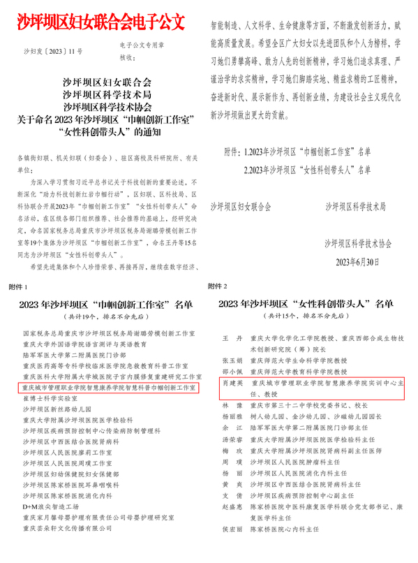 近日,由沙坪坝区妇联、区科技局、区科协联合开展的“巾帼创新工作室”“女性科创带头人”命名名单揭晓。根据前期申报及后期遴选,我校智慧康养学院实训中心主任肖建英教授被命名为沙坪坝区“女性科创带头人”、重庆城市管理职业学院智慧科普巾帼创新工作室被命名为沙坪坝区“巾帼创新工作室”。