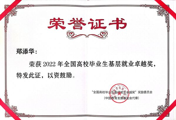 根据教育部高校学生司近日转发的“全国高校毕业生基层就业卓越奖”奖励委员会《关于公布2022年“全国高校毕业生基层就业卓越奖”获奖人选的通知》内容,我校教师郑添华荣获2022年“全国高校毕业生基层就业卓越奖”。