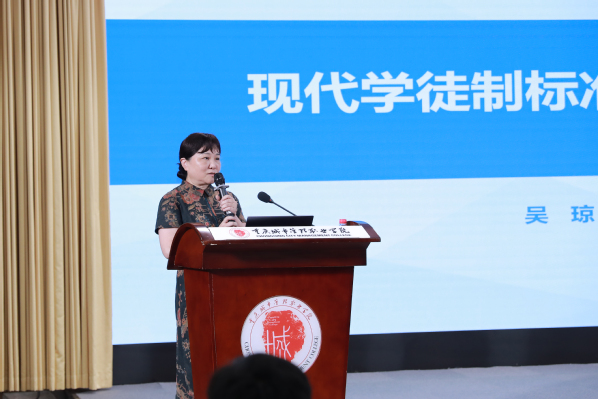 全国现代学徒制工作专家指导委员会入库专家、中国美发美容协会产教融合专业委员会常务副主任吴琼作了题为《现代学徒制标准研制与课程开发》的报告,吴琼从课程标准研制概述、课程开发基本路径、课程标准编制要素、学徒岗位课程实例为大家带来了学徒制标准研制与课程开发的途径,指导老师们如何实现课程与能力对接、课程定位、双元育人、教学组织等,让与会人员受益颇多。