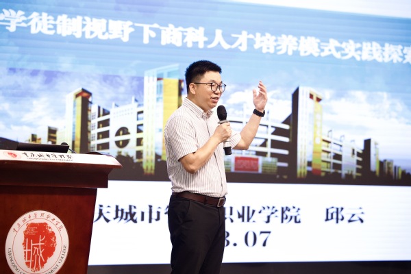 教育部第二批现代学徒制试点项目连锁经营管理专业、连锁经营管理国家级骨干专业、现代物流管理重庆市高水平专业群、重庆“双基地”“高基地”建设项目负责人、重庆城市管理职业学院商学院副院长邱云作了题为《学徒制视野下商科人才培养模式实践探索》的主题报告,他从育人的实效说起,学徒制的基本认知,十五年探索与实践,携手双百强、推行学徒制、共育“双感双能”人才等四个方面和参会人员进行了经验交流分享,提出选好合作伙伴、确定培养目标、构建培养体系、打造“双基地”创设育人环境、校企共同完善人才培养方案、研制标准制度、打造专业群品牌等,引起了参会人员的强烈共鸣。