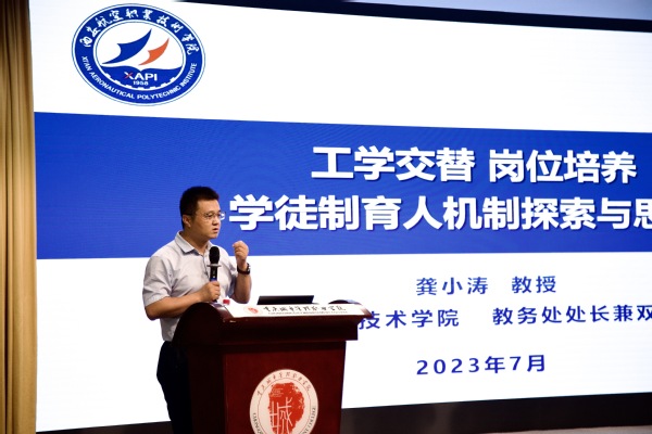 陕西高校“青年杰出人才支持计划”,陕西省第四届黄炎培职业教育“杰出贡献奖”,西安航空职业技术学院教务处处长兼项目办主任龚小涛教授作了题为《工学交替 岗位培养 学徒制育人机制探索与思考》的主题报告,龚小涛从学徒内涵,岗位培养、工学交替;西航实践,协同共生、项目引领等方面提出岗位培养与岗位实习的区别,现代学徒制与订单班的区别,学习地点、学习方式、校企导师、教学模式等工学交替举措,如何共建产业学院,推动校企资源共享、人员共用、技能共研、功能互补的产教融合学徒制育人模式。