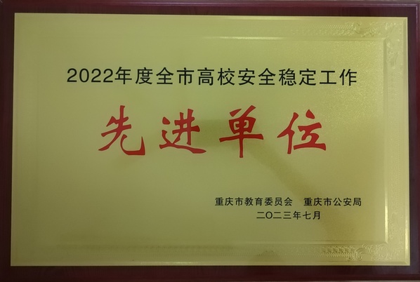 近日,重庆市教育委员会 重庆市公安局联合下发《关于2022年度维护高校政治安全和校园稳定工作先进集体和先进个人的通报》,我校荣获重庆市维护高校政治安全和校园稳定工作先进集体,陈鹏、周世兵、李孟函三位同志荣获重庆市维护高校政治安全和校园稳定工作先进个人。