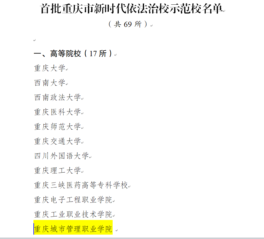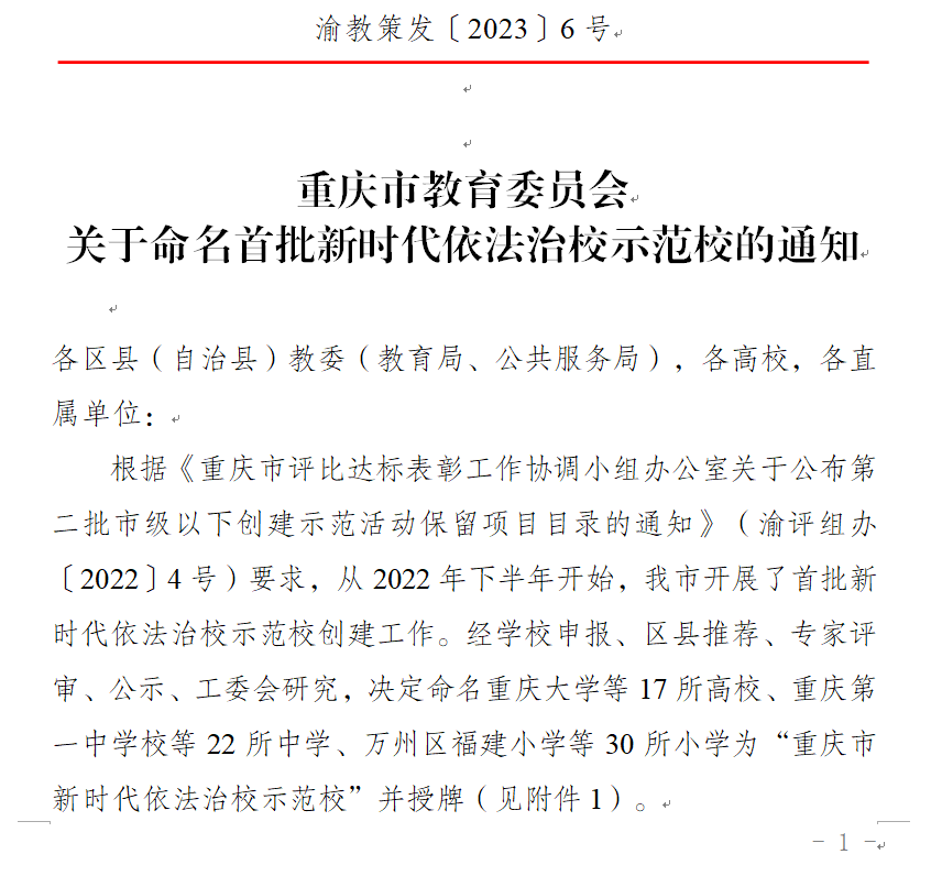 近日,市教委印发《关于命名首批新时代依法治校示范校的通知》(渝教策发〔2023〕6号),我校被命名为重庆市首批“新时代依法治校示范校”。
