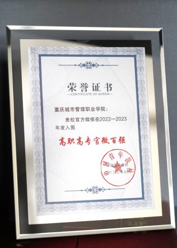 近日,由中国青年报社主办的融媒体时代高校可视化探索研学会暨校媒精英汇在沈阳举办,会议现场揭晓了2022—2023年度中国大学官微百强、高职高专官微百强等奖项。我校官方微信公众号“重庆城市管理职业学院”成功入围2022—2023年度全国高职高专官微百强榜,位居第54名。这是我校自2019年以来第五次入围全国高职高专百强官微。此外,我校官方微信公众号运营团队“校媒中心”也被评为2022-2023年度全国优秀职院可视化融媒团队。