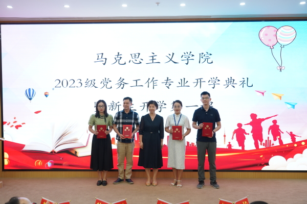 之后,喻永均宣读了2023级党务工作专业首届学业导师名单,并由张新为其颁发聘书。首届学业导师由马克思主义学院领导、党务工作教研室教师和各教研室主任担任,通过“一对多”的培养模式,引导马院老师关注学生从入学到毕业整个教育过程和学生的思想、学习、生活等各个环节,实现因材施教和个性化培养,有效地提高学生的综合素质、创新能力和实践能力。同时,各位领导为学生赠送“入学礼包”,礼包中包含《共产党宣言》《习近平的七年知青岁月》等书籍及学习用品,体现了学院对2023级新生的期待、关怀和勉励,也充分彰显了马克思主义理论类的学科特色,传达了学院对学生的期望,鼓励新生要端正学习态度,始终发扬勤奋好学的精神。新生纷纷表示,通过这份礼物,感受到了学院的关心关爱,一定珍惜大学时光,锐意进取,不负期望。