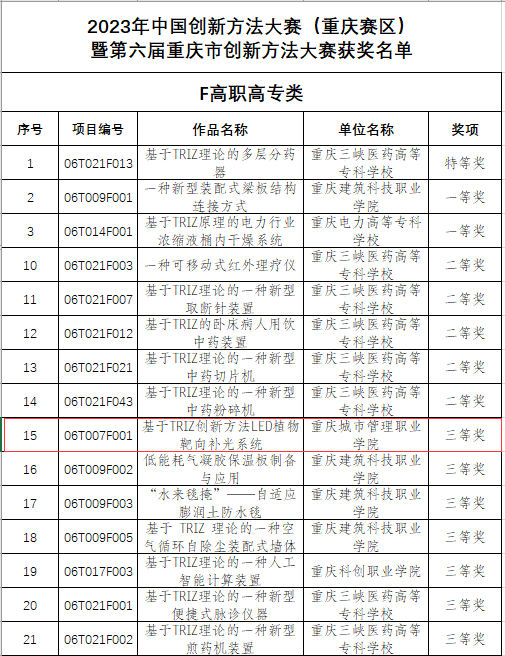 我校智能工程学院、大数据与信息产业学院共组织3支学生队伍参加比赛,经专家线上双盲评审、组委会审核,现场答辩,陈婷、张小玲老师指导的项目《基于TRIZ创新方法LED植物靶向补光系统》荣获三等奖。