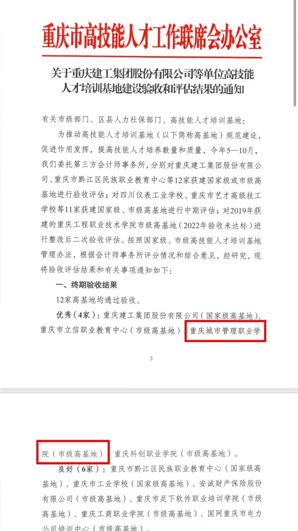 根据重庆市高技能人才工作联席会办公室《关于重庆建工集团股份有限公司等单位高技能人才培训基地建设验收和评估结果的通知》精神,近日,我校以优秀成绩通过重庆市级高技能人才培训基地终期验收。