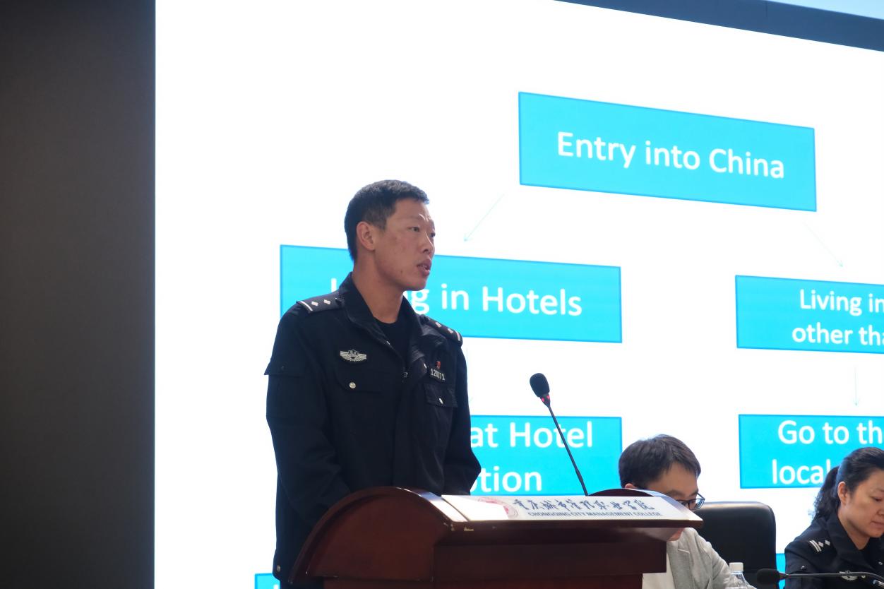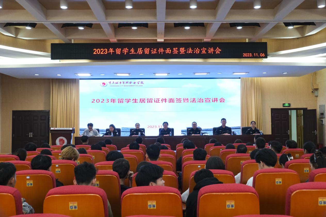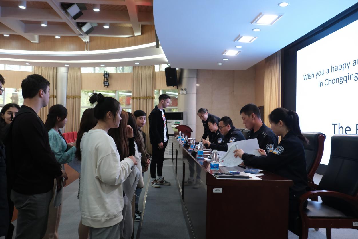 11月6日,重庆市公安局出入境管理总队境外人员管理支队和高新区公安分局出入境管理支队五名警官在办公楼103会议室为我校76名国际学生举行了居留证件面签暨法治宣讲会。学校副校长莫堃,以及国际合作与交流中心、相关二级学院负责人参加会议,会议由国际合作与交流中心科长金瀚文主持。