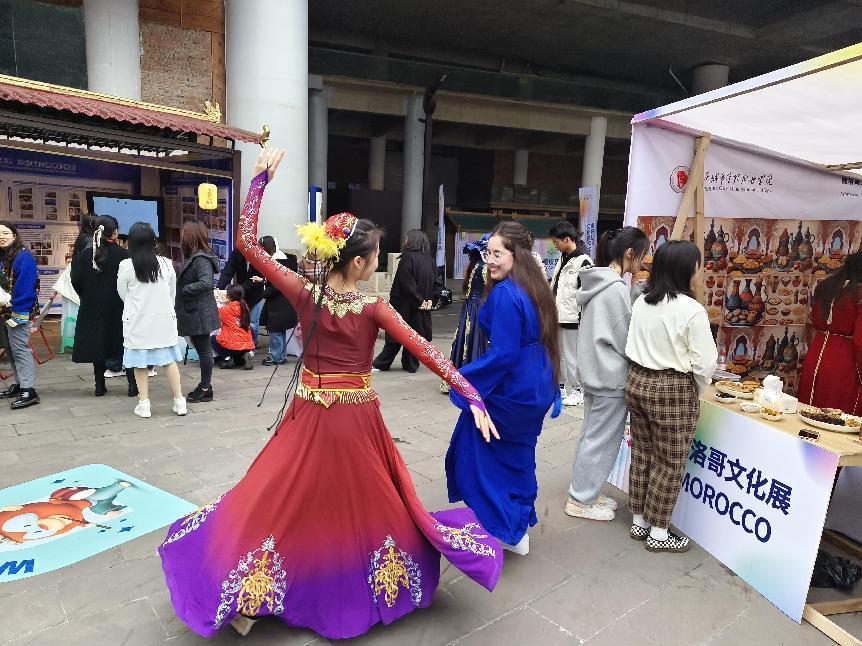 活动现场,我校摩洛哥国际学生热情招待每一位驻足文化集市展位的游客,与他们分享摩洛哥干果,展示摩洛哥卡夫坦长袍、制作摩洛哥茶等。展位内欢声笑语,载歌载舞,青春洋溢,展现了摩洛哥文化和国际文化交流之美。