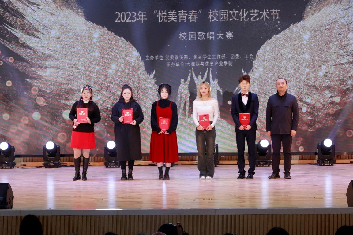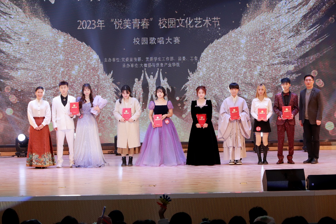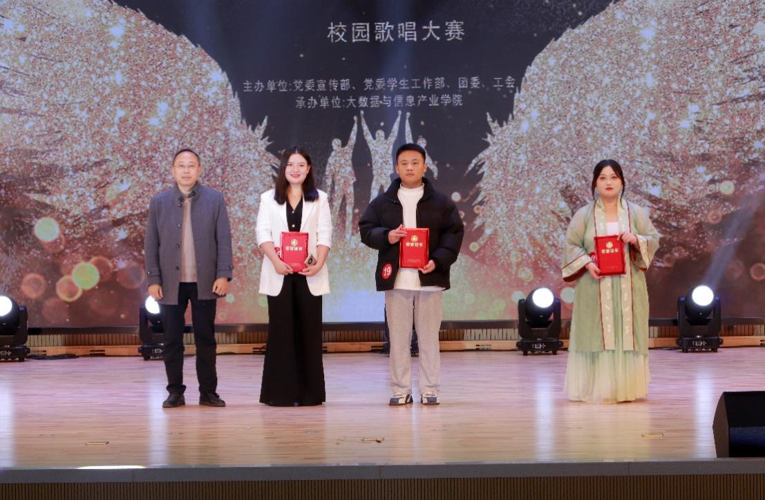 大数据与信息产业学院陈俊宏、程移峻、卢诗羽、王钦和袁彬弘的《夜空中最亮的星》,商学院马万的《牵丝戏》,大数据与信息产业学院袁君的《我们的祖国歌甜花香》,智慧康养学院余彤彤、吴锴的《逐梦》,大数据与信息产业学院万美琪的《诀爱》学生组一等奖三等奖;数智财经学院分工会文忆秋老师的《好好生活就是美好生活》,大数据与信息产业学院分工会李言老师的《满天星辰不及你》,大数据与信息产业学院分工会杨琴老师的《微微》,文化与旅游学院分工会刘璠老师的《月牙泉》荣获教师组三等奖