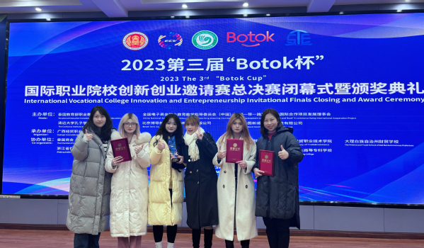 11月19日,第三届Botok杯国际职业院校创新创业邀请赛总决赛在广西经贸职业技术学院举行,来自中国、泰国、马来西亚的50支职业院校参赛队伍,共330名师生齐聚邕城展开角逐。据悉,该赛项由泰国教育部职业教育委员会、全国职业教育教学指导委员会(中国)、“一带一路”电商谷产教融合国际合作项目发展理事会、清迈大学孔子学院等主办,旨在助推中泰及东盟国家职业院校培养适应数字经济发展需要的复合型技能人才,助力国际化人文和经贸交流与合作。历经了三个月的组队、选拔、备赛,由跨境电商专业大二学生瞿文、彭天棋、任春来、余明蔓组成的“伍条”队经过紧张激烈比拼,最终夺得大赛一等奖,指导老师翁文娟、何林静被评为“优秀指导教师”。