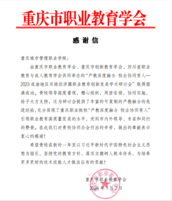 1月2日,重庆市职业教育学会发来感谢信,衷心感谢我校在“产教深度融合 校企协同育人”2023 成渝地区双城经济圈职业教育创新发展学术研讨会中校领导的高度重视与大力支持,感谢学校有关教师为研讨会提供了丰富的可复制的产教融合先进经验,并希望在新的一年里,学校能培养出更多更好的技术技能人才!