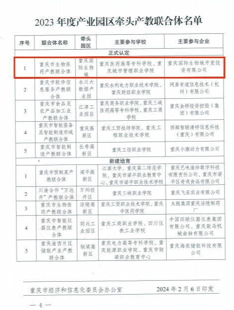近日,重庆市经济和信息化委员会、重庆市教育委员会公布了2023年度产业园区牵头产教联合体名单的通知,由重庆国际生物城牵头,重庆国际生物城开发投资有限公司、重庆医药高等专科学校和我校主要参与申报的重庆市生物医药产教联合体入选2023年度产业园区牵头产教联合体名单。