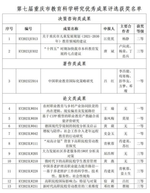 近日,重庆市教育委员会公布了第七届重庆市教育科学研究优秀成果评选的获奖情况。我校在决策咨询类成果、著作类成果、论文类成果中有13项成果获奖,其中一等奖5项,二等奖2项,三等奖6项。获奖总数居全市第四,高职院校第一。