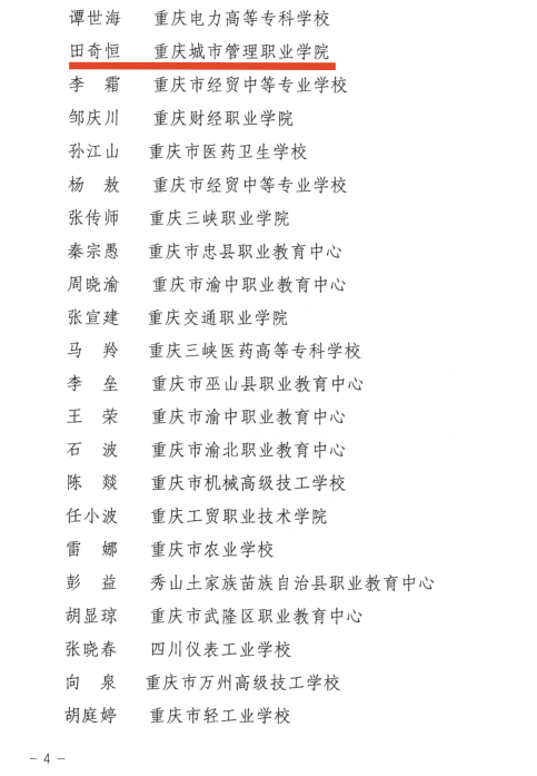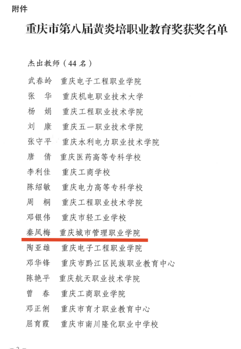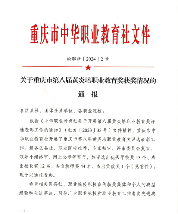 近日,重庆市中华职业教育社正式公布第八届黄炎培职业教育奖获奖名单,我校荣获黄炎培职业教育“优秀学校奖”。学校智慧康养学院党总支副书记、院长田奇恒教授,大数据与信息产业学院秦凤梅教授获“杰出教师奖”。