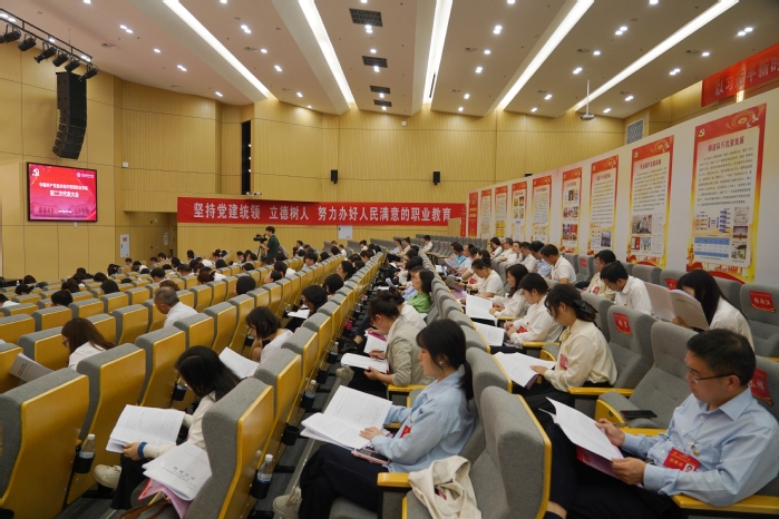 会场气氛庄严、热烈,大会主席台正中悬挂中国共产党党徽,会场主席台对面悬挂“以习近平新时代中国特色社会主义思想为指导,为建设特色鲜明的高水平职业大学而团结奋斗”的标语。