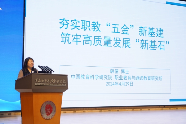 启动仪式后,来自中国教育科学研究院职业教育与继续教育研究所韩倩博⼠做了《夯实职教“五金”新基建 筑牢高质量发展“新基石”》的专题报告,分析了现代职业教育体系改革的基本任务和“一体两翼五重点”的职业教育改革框架,探讨了” 金专业、金课程、金师资、金教材、金基地”等职业教育新基建的基本内容和推进路径。