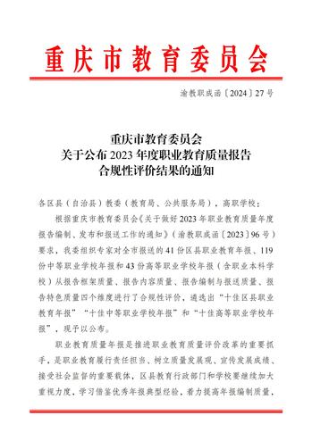5月9日,重庆市教育委员会发布《关于公布2023年度职业教育质量报告合规性评价结果的通知》(渝教职成函〔2024〕27号),公布重庆市2023年度职业教育质量报告合规性评价结果。我校荣获“2023年度重庆市十佳高等职业学校年报”荣誉称号。