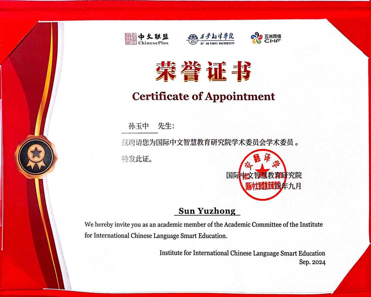 会上,孙玉中被授予国际中文智慧教育研究院学术委员会学术委员证书。