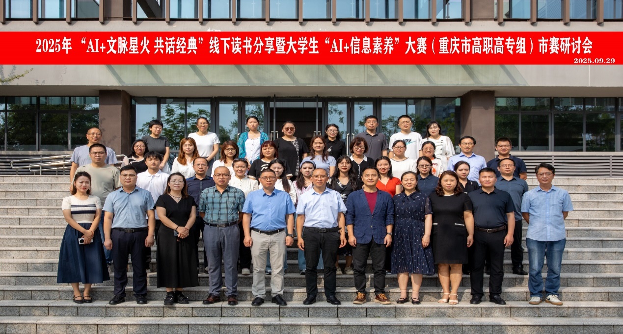 9月28日,由重庆市高校图工委高职高专专委会和我校共同主办的2025年第一届重庆市高职高专“AI+文脉星火,共话经典”线下读书分享暨大学生“AI+信息素养”大赛(重庆市高职高专组)市赛研讨会在学校敏学厅举行。来自重庆市高校图书馆馆长(主任)及同仁80余人参会,会议由我校图书馆馆长孙雪梅主持。